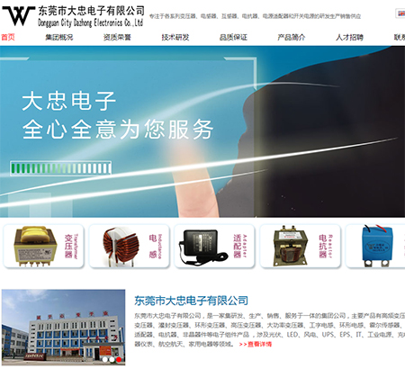 電子變壓器、電感器、電源適配器網(wǎng)站建設(shè)公司,做網(wǎng)站優(yōu)化關(guān)鍵詞排名SEO,營銷型,手機網(wǎng)站建設(shè),響應(yīng)式,品牌型,電商/門戶,電子變壓器、電感器、電源適配器外貿(mào)型網(wǎng)站建設(shè). 東莞市大忠電子有限公司是一家集研發(fā)、生產(chǎn)、銷售為一體的專業(yè)電子變壓器、電感器、電源適配器制造廠商。
