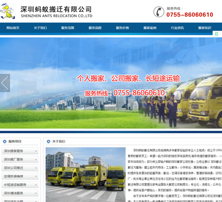 深圳南山搬家,羅湖搬家,福田搬家網站建設公司,做網站優化關鍵詞排名SEO,營銷型,手機網站建設,響應式,品牌型,電商/門戶,深圳南山搬家,羅湖搬家,福田搬家外貿型網站建設. 深圳搬遷公司成立于1996年,是深圳特區最早成立并以“螞蟻搬家”注冊的獨資深圳搬遷公司。